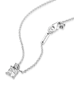 A piece to stand the test of time. this delicate Sparkling Collier Round & Square Pendant Necklace is a modern classic. Hand-finished in sterling silver. the necklace includes a pendant featuring sparkling clear cubic zirconia stones of two different cuts and sizes – a round stone on top of a square stone – that sit loosely on the chain in large prongs. The necklace length is adjustable. making this versatile piece the ideal finishing touch to any outfit.