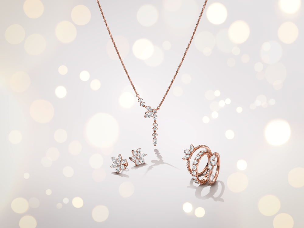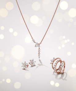 Bring the beauty of nature to your jewellery with our Sparkling Herbarium Cluster Drop Collier Necklace. This statement design features gracefully tumbling stones that fall from a central cluster of round. pear-shaped and marquise-cut cubic zirconia. forming a geometric shape inspired by petal and leaf elements. An elegant reinterpretation of the shapes we find in nature. this 14k rose gold-plated necklace is perfect for bringing a touch of the natural world to your everyday looks.