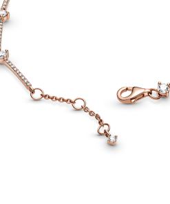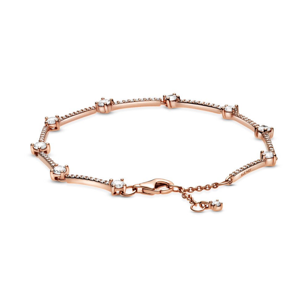 Level up your look with the Sparkling Pavé Bars Bracelet. Hand-finished in Pandora Rose (14k rose gold-plated unique metal blend). this design is inspired by a piece from Pandora’s archive. Featuring rigid bars decorated with smaller clear stones set between larger ones. this bracelet includes a lobster clasp closure with a stone dangle tag at the end. Adjustable in size. offset the warm tones of this bracelet with bangles in sterling silver.