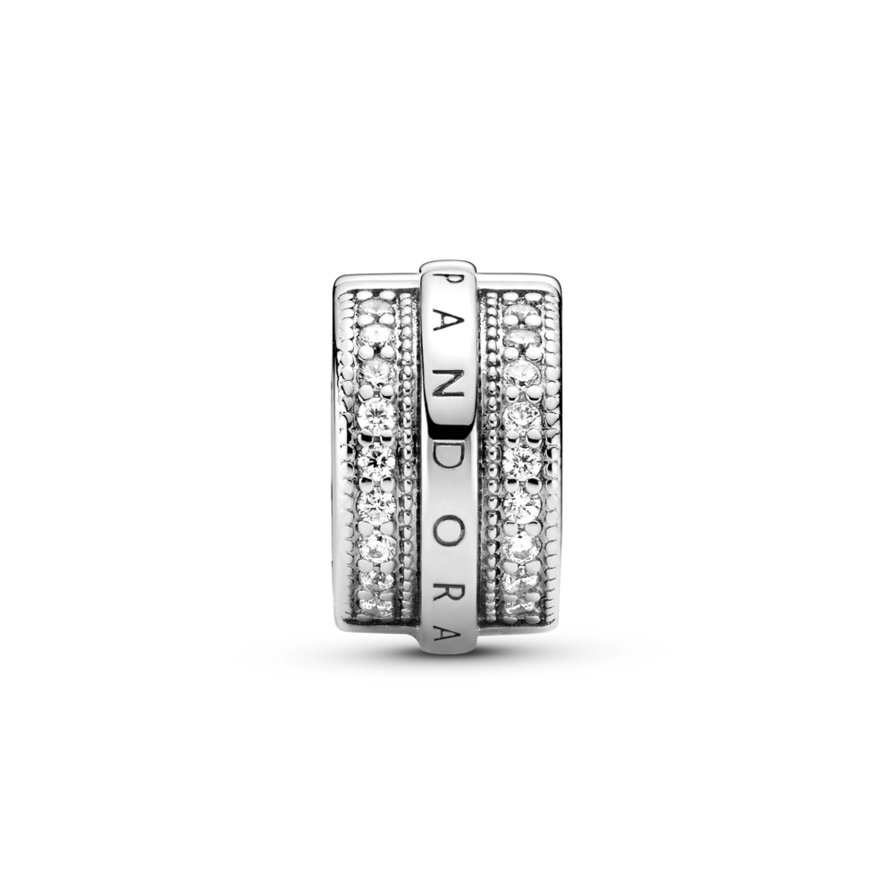 Make every day a little special with the Sparkling Pavé Lines & Logo Clip Charm. Hand-finished in sterling silver with two rows of bead-set clear cubic zirconia and a raised row with Pandora logo in the centre. this clip charm can be worn to any event in any season and will make a sophisticated style statement. The sparkling pavé. embossed hearts and square edges bring intriguing detail to this instantly iconic piece. This clip charm features a silicone grip. does not fit onto threads (two raised charm dividers.) This charm can be styled anywhere else on the bracelet.