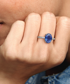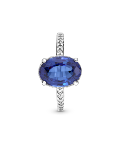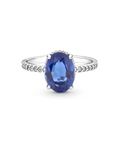 The Sparkling Statement Halo Ring will bring glamour to any occasion. The ring features a striking blue oval man-made crystal that’s been cut to show off the rich colour from the sides. accented by a pavé halo underneath. Hand-finished in sterling silver. the band is adorned with sparkling cubic zirconia stones in a nod to traditional styles. The dazzling design looks equally beautiful worn on its own or layered with other rings. A piece to stand the test of time.