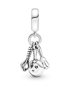 Get in the mood to cook with the Spatula. Frying Pan & Whisk Dangle Charm. Hand-finished in sterling silver. this cooking charm features one dangle shaped like a spatula. another dangle shaped like a whisk and a third dangle shaped like a frying pan. The frying pan has two sparkling cubic zirconia stones that represent food on the front and cut-out hearts on the back. Perfect for foodies and home chefs. this charm is full of culinary style.