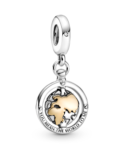 Gift the love of your life the Spinning World Dangle Charm. Hand-finished in sterling silver. this design features a flat spinning globe inside a round frame with a sparkling stone on the bail. Including engraved longitude and latitude lines. the globe’s continents are hand-finished in 14k gold. The frame has small lifted hearts and the engraving You mean the world to me on the front with the Pandora logo on the back. Show your love knows no limits with this piece.