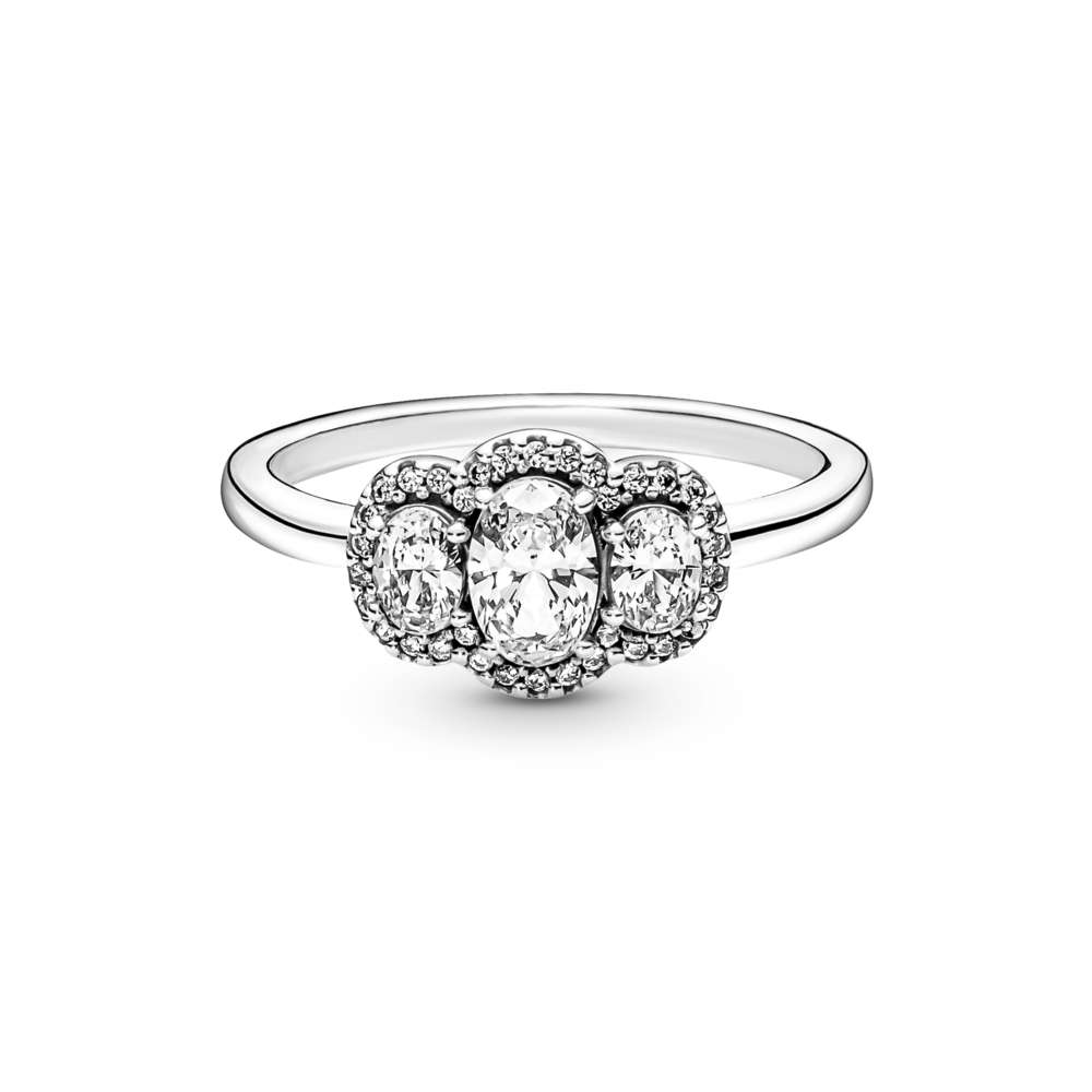 Bring sophistication to any look with the Three Stone Vintage Ring. Hand-finished in sterling silver. this ring is set with two oval cut cubic zirconia stones on either side of a large oval centre stone. A pavé halo frames the three large stones. while a thin band and open sides on the basket holding the stones give the ring a delicate look. Stack this ring with hand-finished styles in other metal tones for a statement mixed-metal look.