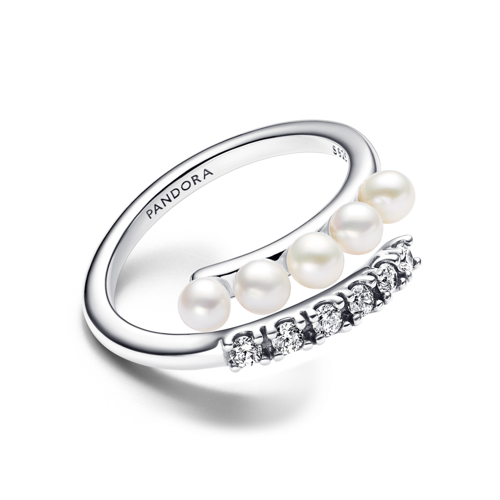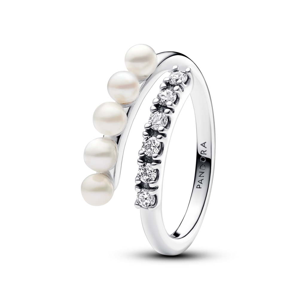 Sterling silver open ring with white treated freshwater cultured pearl and clear cubic zirconia
