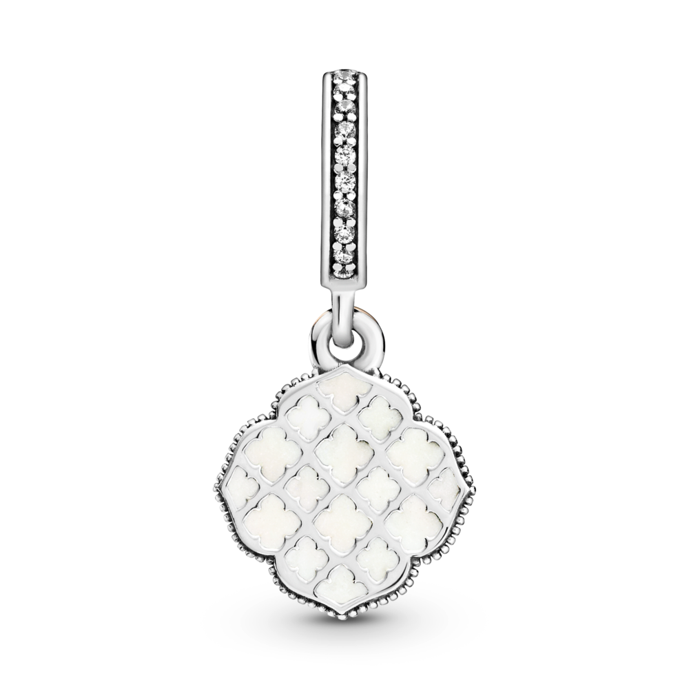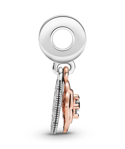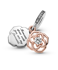 Express your love with the Two-tone Rose Dangle Charm. Hand-finished in sterling silver and Pandora Rose (14k rose gold-plated unique metal blend). the front disc features an openwork rose with a large centre stone. The back disc includes the engraving Moments spent with you are my favourite on the front. with a double row of beading along the border. The back features hand-applied shimmering silver enamel in a chequered pattern. Show someone how much you care with this special design.